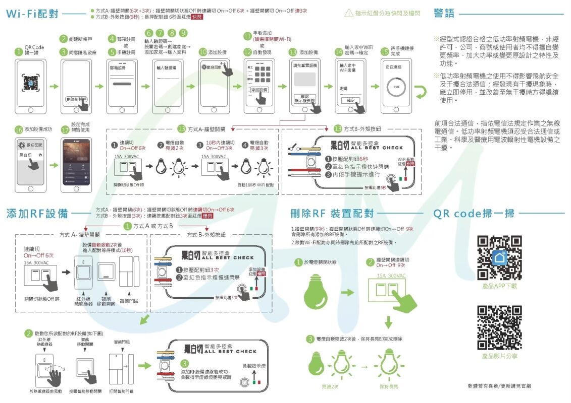 ✔ 後裝市場 (既成屋/舊屋翻新) ◎ 已有出門一鍵關燈的配備 ➡ 購買 智能黑白切 ◎ 沒有出門一鍵關燈的配備 ➡ 購買 智能黑白切 + RCS節能開關 + 搖頭開關(配電箱)