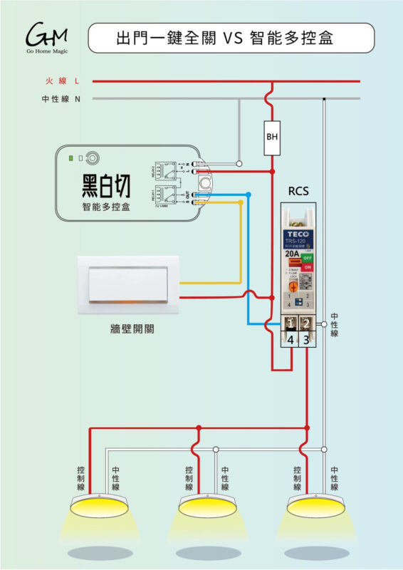 ※ 已有出門一鍵關燈的功能,要確認RCS節能開關為激磁式,才能和智能黑白切搭配使用。
